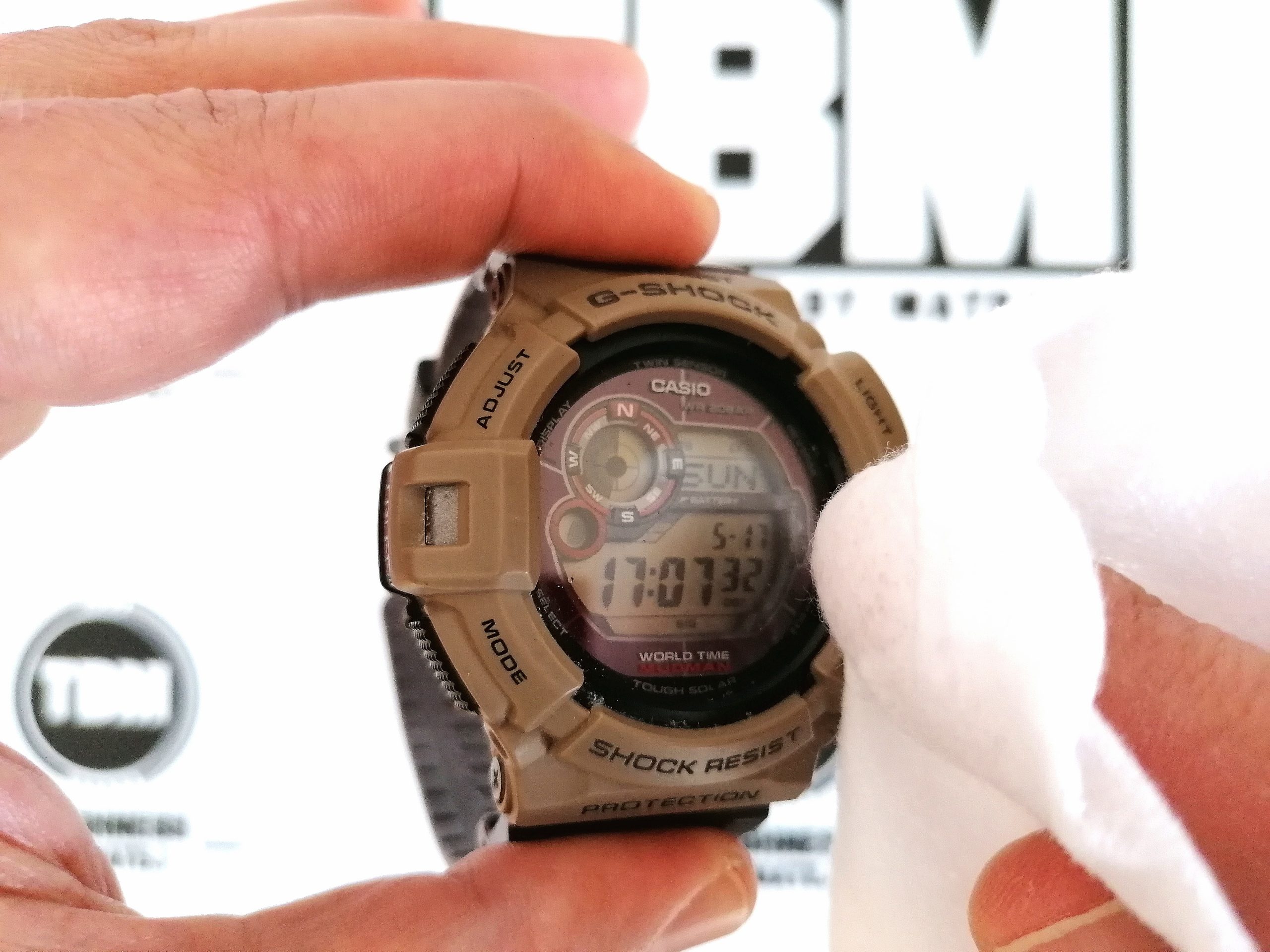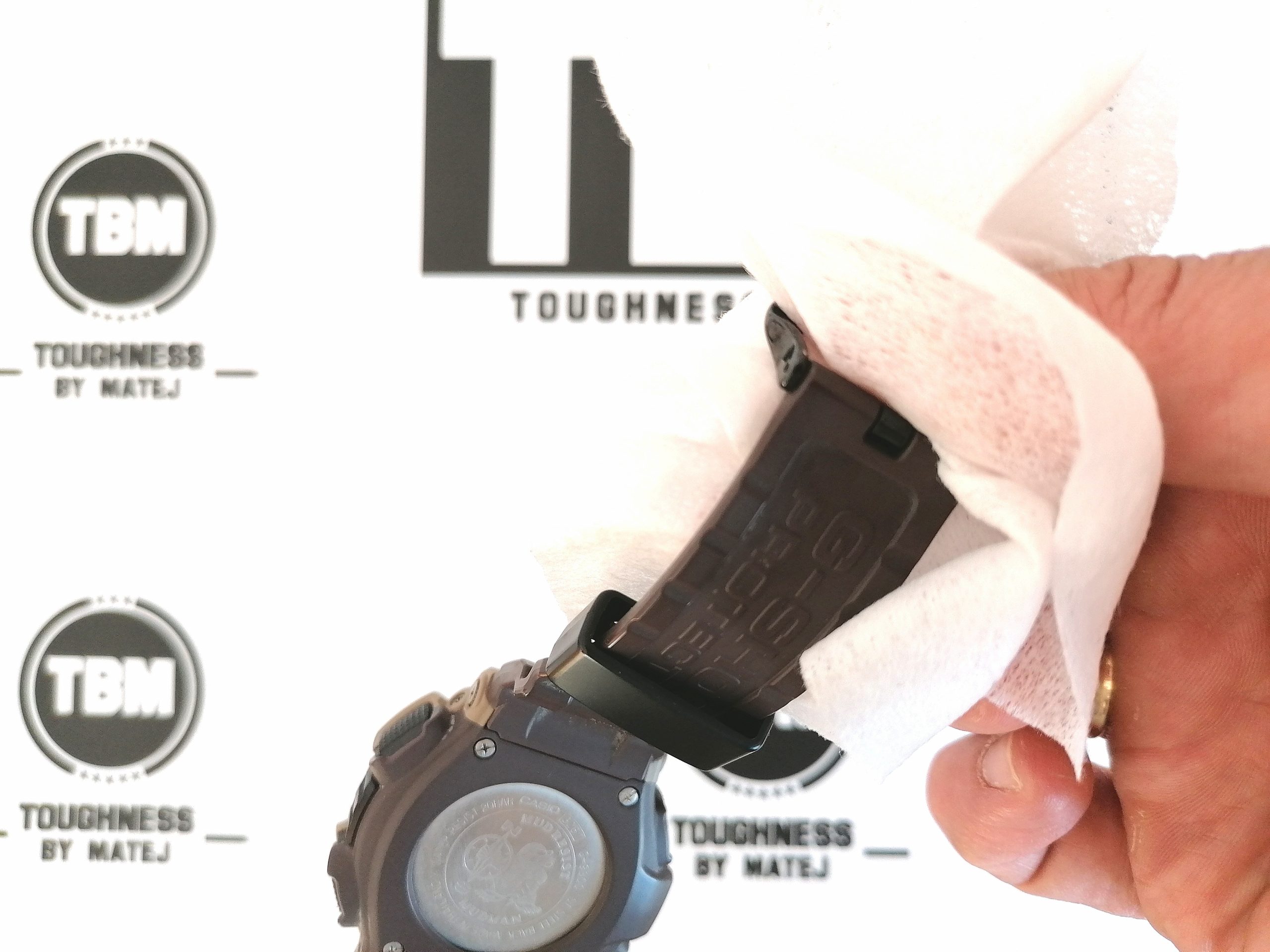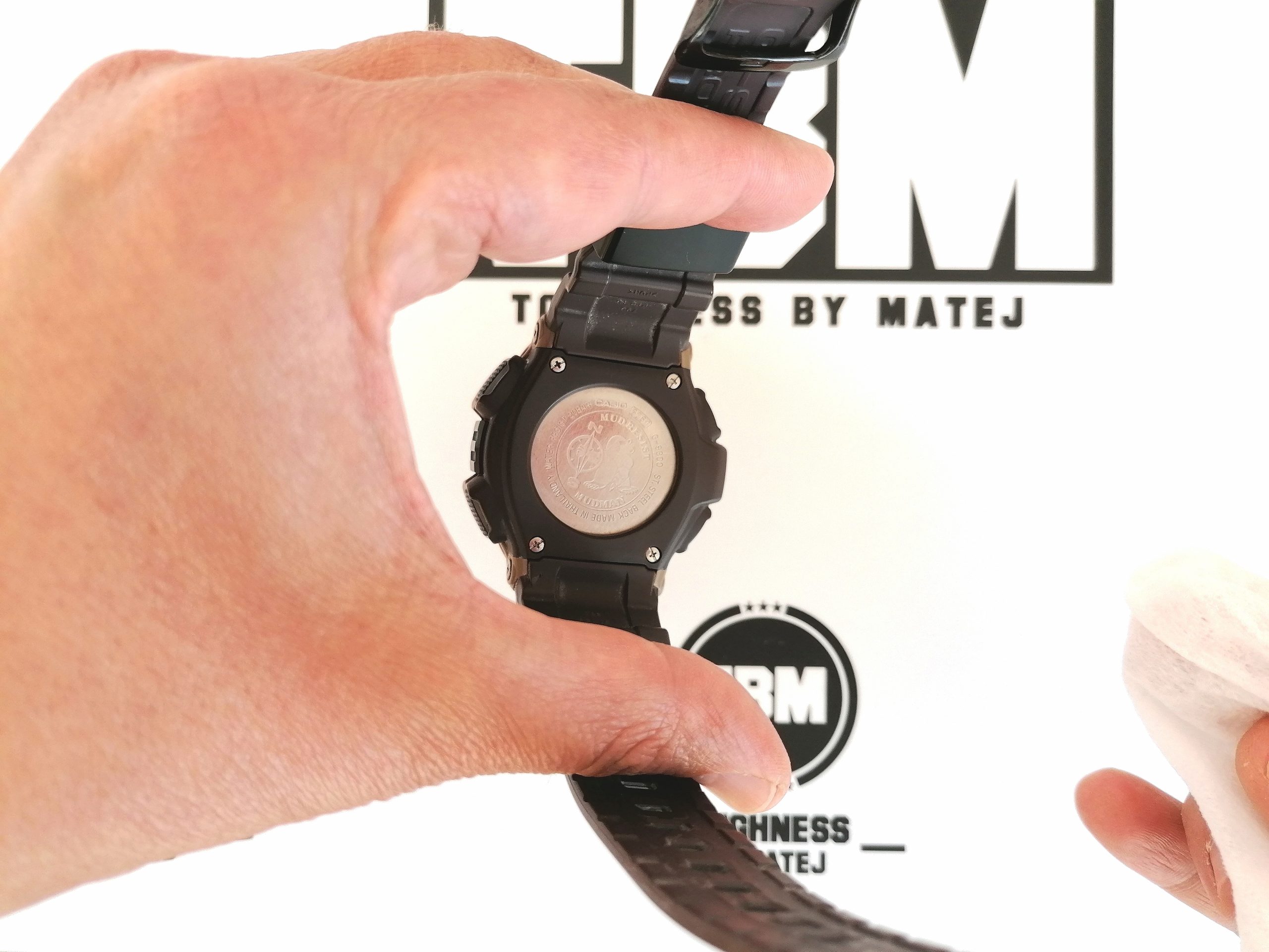 Następnie trzymając zegarek odwracamy go szkiełkiem do dołu, krótszą część paska chwytamy palcami wskazującym i środkowym, kciukiem natomiast odchylamy dłuższą część paska. W taki oto sposób mamy możliwość dokładnego przetarcia dekla naszego G-Shocka.