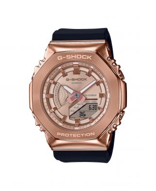 GM-S2100PG-1A4 nawiązuje kolorystyką do wyżej zaprezentowanych modeli z serii MSG. Znajdziemy tutaj czarny pasek oraz złoty stalowy bezel z oznaczeniami G-SHOCK i PROTECTION. Zasadniczą różnicą jest to, że kolor złoty przenika całą tarczę i idealnie komponuje się z pozytywowym, dużym wyświetlaczem usytuowanym między godzinami 3 i 6. Obsługa modelu jest bardzo intuicyjna i odbywa się za pomocą czterech przycisków.