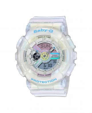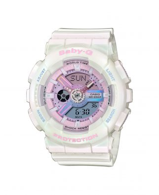 Zupełnie inną propozycją prezentu na walentyki jest najnowsza odsłona Baby-B w postaci modelu BA-110PL-7A2. Ten G-Shock dla kobiety to kultowa już potężna struktura gwarantująca niebywałą prezencję na damskim nadgarstku. BA-110 to bowiem nawiązanie do męskiej serii GA-110, która obok wielkości różni się tylko pewnymi detalami. Zestawiając BA-110 z GA-110 od razu widać, iż są to modele oddające zamysł stworzenia niezniszczalnych zegarków. Jednak BA-110PL-7A2 jako najnowsza propozycja z serii wyróżnia się niepowtarzalną kolorystyką. Na uwagę zasługują transparentny pasek i bezel, który dzięki kolorowi koperty wydaje się być w odcieniu perłowej bieli. Delikatnie niebieskie-główne napisy na bezelu: Baby-G i PROTECTION nawiązują do tego, co dzieje się na tarczy. Warto przypomnieć, że BA-110 to połączenie wskazówek (godzinowej i minutowej) z rozbudowanym wyświetlaczem, który w zasadzie w całości wypełnia tarczę. Górna część wyświetlacza posiada delikatnie różowe zabarwienie, które na godzinie 3 przełamane zostało właśnie kolorem błękitnym. Co ciekawe, dolna jego część pozostała neutralna kolorystycznie. W tej wersji cały wyświetlacz jest pozytywowy – dość rzadko spotykany rodzaj wyświetlacza w serii.