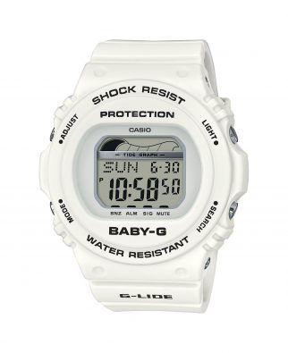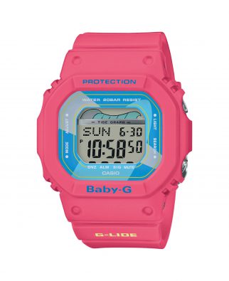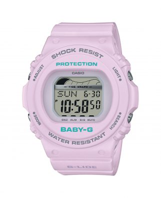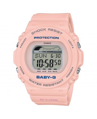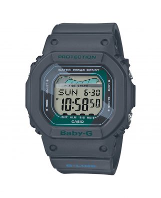 BLX-560-1 należy do serii G-LIDE. Oznacza to, że motywem przewodnim jest tutaj wykres pływów morskich, który projektanci zdecydowali się umieścić w górnej części wyświetlacza, na całej jego szerokości. G-Shock generalnie łączy funkcję pływów morskich z fazami księżyca, które również znajdziemy w tym modelu. Jest to niewątpliwie zegarek dla kobiety, który spośród zaprezentowanych modeli zdecydowanie najbardziej kojarzy się z wodną aktywnością. Pamiętajmy jednak, że zegarków G-Shock nie można szufladkować. Czerń w tym wyjątkowym modelu stanowi niejako kamuflaż sportowego pochodzenia, dzięki czemu swobodnie może być użytkowany jako zegarek na co dzień.