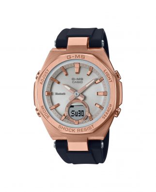 MSG-B100G-1AER jako jedyna wersja zaprezentowana została na elastycznym pasku z wysokiej jakości tworzywa. Jest on w kolorze czarnym, przez co wyraźnie oddziela się od stalowego bezela w kolorze różowego złota. Wskazówki i indeksy w tym samym złotym odcieniu cudownie prezentują się na perłowej tarczy, zapewniając swobodę odczytu godziny. Jest to G-Shock dla kobiety, która preferuje połączenie elegancji z wygodą i swobodą użytkowania wynikającą z zastosowania elastycznego paska.