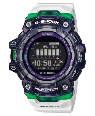 GBD-100SM-1A7ER – biały pasek, zielone i fioletowe wstawki idealnie komponują się z negatywowym wyświetlaczem. Zieleń jest bardziej stonowana, przez co czyni projekt bardziej dojrzałym.