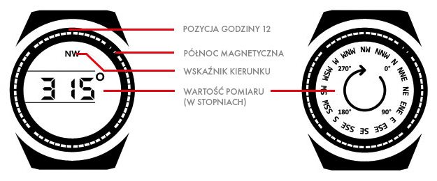 Z każdą nową pozycją, wyświetlana wartość kierunku zmienia się. Mikroprocesor przetwarza zmiany a dzięki temu są one wyświetlane na zegarku.