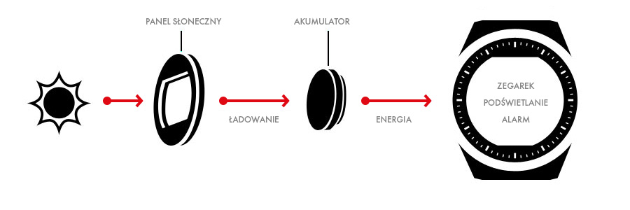Akumulator w zegarkach z solarem zachowuje nadmiar energii i uwalnia go, gdy zegarek jest w ciemności. Zegarki z funkcją solar są zawsze wyposażone w akumulator, który ładuje się automatycznie i nie potrzebuje żadnego ręcznego sterowania.